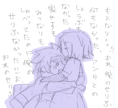 まず毛利のツン度が低めだと思います。アニキのマッチョ度も低めですね。というか、マッチョじゃない、描けない(笑)でもこれがすずます宅の瀬戸内です。好きだ!ずっとラブラブしてればいいんです。脳内で。